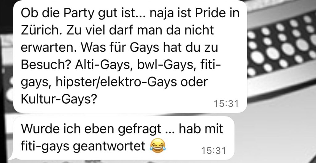 Als ich mit der Mickey Mouse nach Zürich wollte, um Flavio zu besuchen, wurde er von seinen Leuten gefragt, welche Gays denn da in die Schweiz kämen: Alti-Gays, BWL-Gays, Fiti-Gays, Hipster/Electro-Gays oder Kultur-Gays? Damals musste ich schmunzeln und habe für uns zwei Kategorien veranschlagen wollen. Nämlich Fiti- & Kultur-Gays. Und genau diese Mischung hat mich immer an Männern gereizt. Viele Fiti-Kultur-Gays gibt es einfach nicht. Ich stelle gar die These auf, dass Teflon, Mickey Mouse und ich die einzigen in einem großen Umkreis sind. Hinzu kommt, dass ich ein freiheitsliebender Mensch bin und sehr viel Zeit für mich, Gym und Bücher benötige.