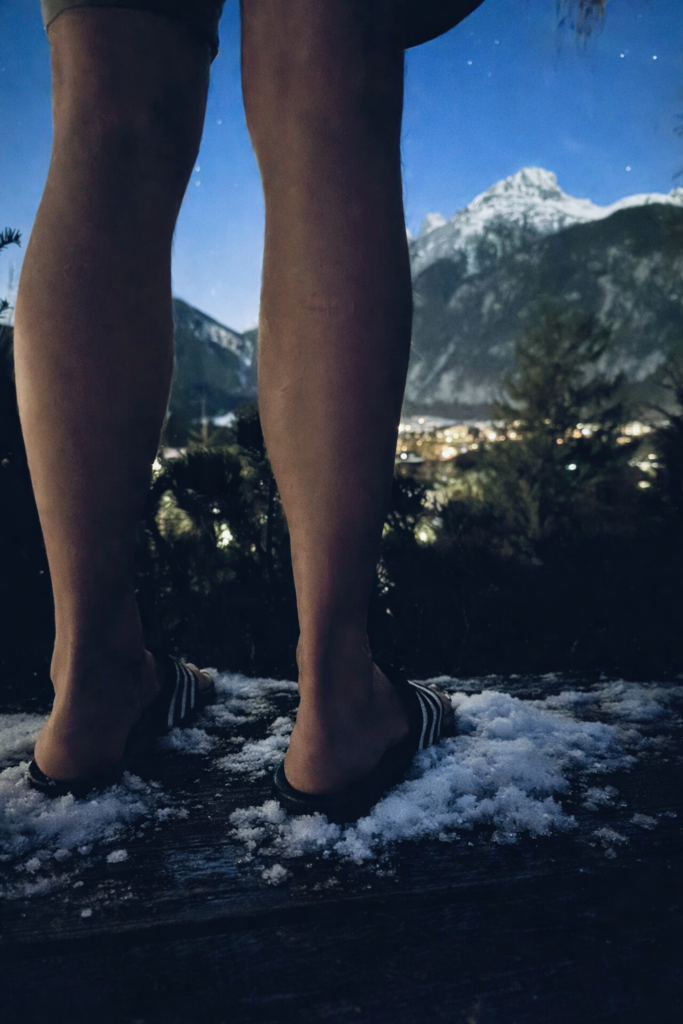 Vor mir liegt das Tal mit dem kleinen österreichischen Dörfchen; nur wenige Lichter leuchten um diese Uhrzeit in den Häusern. Mein Atem lässt kleine Wolken vor meinem Mund tanzen, die Haare an meinen nackten Beinen und Armen stellen sich auf. Gänsehaut überzieht meinen Körper. Die Nacht ist sternenklar und es sind einige Grad unter 0.